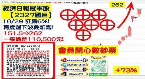 (2327-TW) 國巨,151.5=>262 領先預告後大漲 + 73%,為全球被動元件龍頭,產品涵蓋電阻、電容、天線與主動元件等,定位於高階電子零組件供應商,根據 2025 年產業資料,國巨總市值約 5,099 億元,9 月營收達 116.8 億元,年增 12.15%,月增 8.57%,再創歷史新高,反映車用、工業及通訊需求穩健回升,國巨受惠於併購整合效益與高階產品滲透率提升,營運動能強勁,成長可期,隨著電子市場需求回暖與鉭電容、MLCC 價格穩定上揚,國巨獲利結構優化、毛利率提升,吸引法人資金積極回流,後續市場關注公司法說會展望及工業、車用市場復甦力道,預期將成推升股價表現的關鍵催化因素。