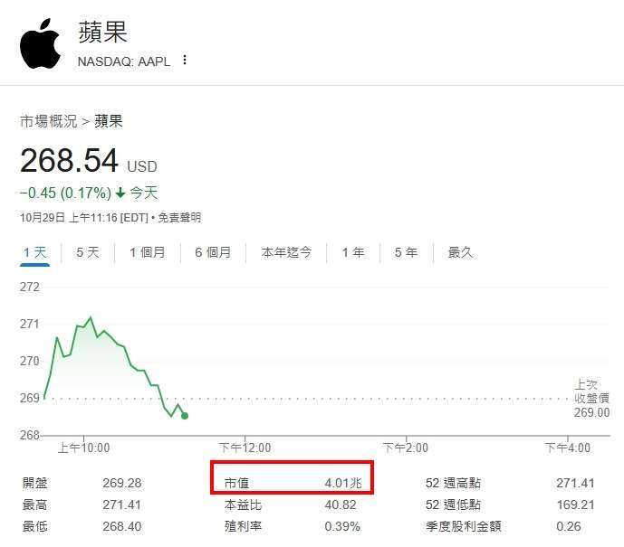 截稿前,蘋果 (AAPL-US) 周三 (29 日) 盤中股價下跌 0.17%,每股暫報 268.54 美元,市值暫報 4.01 兆美元。