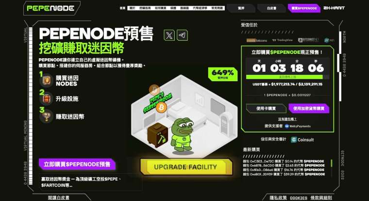 Pepenode 運行於以太坊區塊鏈,用戶可透過購買 Miner Nodes 建立虛擬礦場,模擬迷因挖礦過程並獲得實際代幣獎勵。這種互動式設計讓投資行為兼具遊戲娛樂性與真實收益。每位玩家可升級設備、提高挖礦效率,從而在遊戲中體驗類似「Play-to-Earn」的經濟邏輯。