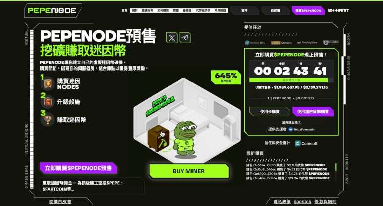 除了文化驅動的項目外,Pepenode($PEPENODE)以結合遊戲與挖礦機制的創新模式受到廣泛關注。該項目建立在以太坊區塊鏈上,將迷因精神與實際收益結構結合,讓投資不僅是押注價格,更是一場互動式參與。