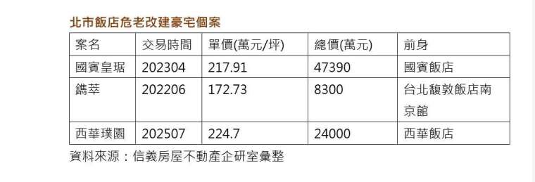 另一個飯店改建豪宅的經典案例則是「國賓皇琚」,2023 年曾揭露總價 4.7 億元,每坪 217.9 萬元的紀錄,實價共揭露 68 筆,總銷售金額超過 100 億元,另一筆危老改建則是南京東路上的「鐫萃」,前身則是台北馥敦飯店南京館,實價揭露單價也出現每坪 172.7 萬元的高價紀錄。