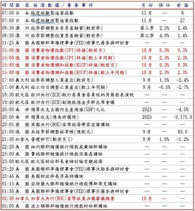 昨日紐西蘭第四季通貨膨脹數據持續低迷,強化紐西蘭央行 (RBNZ) 本月再降息的預期,但西太平洋銀行 - 墨爾本研究院調查澳洲 11 月消費者信心指數升至七年新高 103.8,為 2022 年 2 月以來首見樂觀人數超過悲觀,支持澳洲央行 (RBA) 不再放鬆政策,而且美國政府結束停擺的希望,支撐澳幣和紐元等風險貨幣,歐元兌美元則穩守 1.1546 低點。