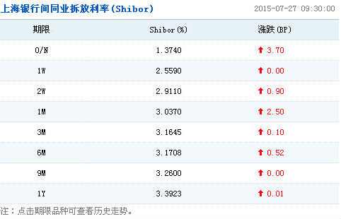 上海銀行間同業拆放利率(Shibor)顯示,隔夜Shibor報1.3740%,上漲3.70個基點;7天Shibor報2.5590%,與前期持平;3個月Shibor報3.1645%,上漲0.10個基點。