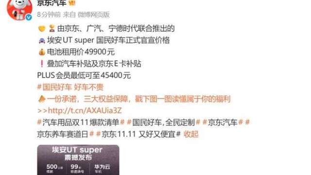 京東周 (9) 日晚間在官方微博正式宣布其與廣汽、寧德時代共同打造的「國民好車」埃安 UT supere 價格,這款定位純電小型車的新能源汽車,租電購買價限時優惠 4.99 萬元 (人民幣,下同) 起,符合條件的京東會員疊加補貼後最低可用 4.54 萬元入手,整車購買價限時優惠 8.99 萬元起,實際到手價約 8.59 萬元,顯著低於此前市場預期的 10 萬元門檻。