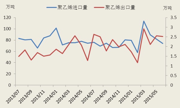 去年大部分時間聚烯烴美金盤處於倒掛,2014年12到2015年2月重回正掛,3月后聚烯烴再次出現倒掛局面,倒掛幅度一度高達500元/噸,貿易商虧損嚴重,影響貿易商進口積極性。隨著煤化工產能的陸續投放,進口聚烯烴份額將被進一步擠壓,我國聚烯烴對外依賴度將不斷下降。2015年6月份pe進口總量74.16萬噸。其中ldpe進口量為16.72萬噸,比上月數量減少11.74%;hdpe進口量40.2萬噸,比上月數量減少2.23%;lldpe進口量為17.24噸,比上月數量減少21.28%。