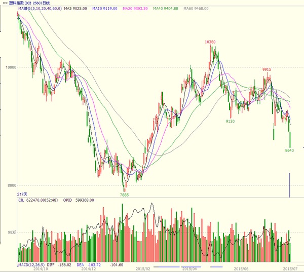 7月以來連塑整體呈現震盪下跌走勢,月初受希臘債務危機愈演愈烈和國內股票市場大跌影響,系統性風險驟然升溫,塑料期貨連續跌停,跌至今年2月以來最低。隨著希臘債務危機解除和國內股票市場止跌企穩,塑料期貨快速反彈,但由於國際原油價格破位下行,以及塑料供給寬鬆,塑料基本面維持偏弱,塑料震盪下跌,7月底塑料跌破前期低點,疲態盡顯。