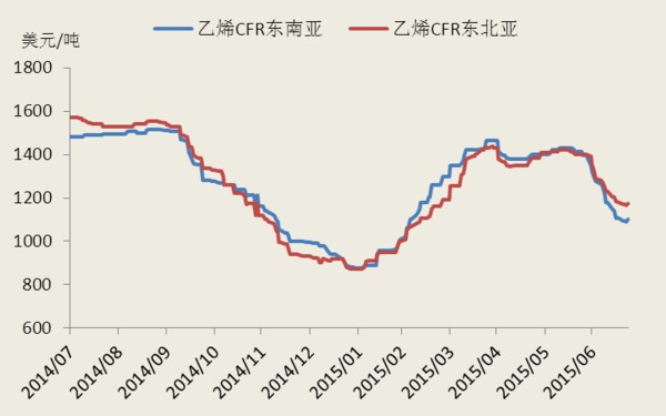 受上周原油繼續下跌影響,上周亞洲乙烯價格維持震盪偏弱走勢,近一個月來乙烯價格已經下跌了超過30%,現已經跌至4個月最低。至上周五,cfr 東北亞上周下跌10.0美元/噸至1175.0美元/噸,cfr 東南亞上周下跌5.0美元/噸漲至1100.0美元/噸。當前亞洲乙烯與石腦油價差在650美元/噸左右,超盈虧平衡價差,亞洲乙烯的價格尚有下降空間。
