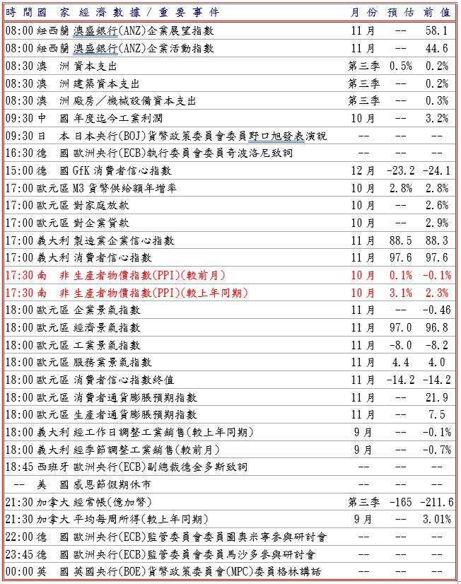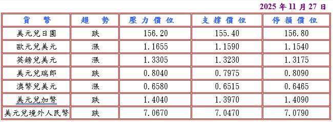 美國數據憂喜參半強化聯邦準備理事會 (FED) 下月降息的預期,而且彭博新聞報導,普遍認為更積極降息的美國國家經濟委員會主任哈西特已是下任 FED 主席熱門人選;此外,週三日本央行 (BOJ) 公布 10 月服務業生產者物價指數 (PPI) 較去年同期放緩至 2.7%,而且日本讀賣新聞報導,日本在野黨嚴陣以待首相高市早苗提前選舉,恐影響 BOJ 升息時間和步伐,但兩位熟悉 BOJ 想法的人稱,過去一周 BOJ 焦點從擔憂美國經濟,轉回日圓疲軟帶來通貨膨脹風險,暗示 12 月仍可能升息,並據日本首相高市早苗表示政府密切關注匯率波動反映經濟基本面或是投機行動驅動,準備採取必要行動,而且日本政府月度報告示警美國貿易政策帶來下行風險,但重申經濟溫和復甦看法,推低美元兌日圓至 155.63 低點。