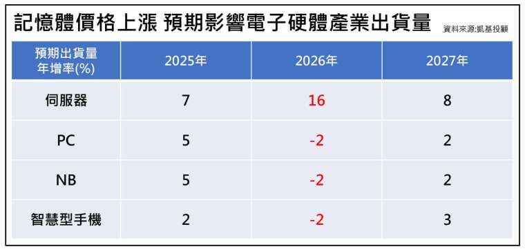 然而,隨著記憶體價格持續上漲,凱基投顧預期 2026 年 PC 與智慧型手機記憶體成本將年增超過 50-60%,多數品牌將提高產品售價,轉嫁部份成本給消費者,降低對獲利率的負面影響,但此將不利 2026 年終端需求,故凱基投顧下修 2026 年全球 PC 出貨量預估至年減 2%,反映消費 PC 與 Chromebook 需求受影響,2026 年全球智慧手機出貨量預估年減 2%,而中低階機種受衝擊程度將超越例如 iPhone 等高階機種,因高階機種比重較高且已與供應商簽訂長約,成本壓力較中低階機種輕。