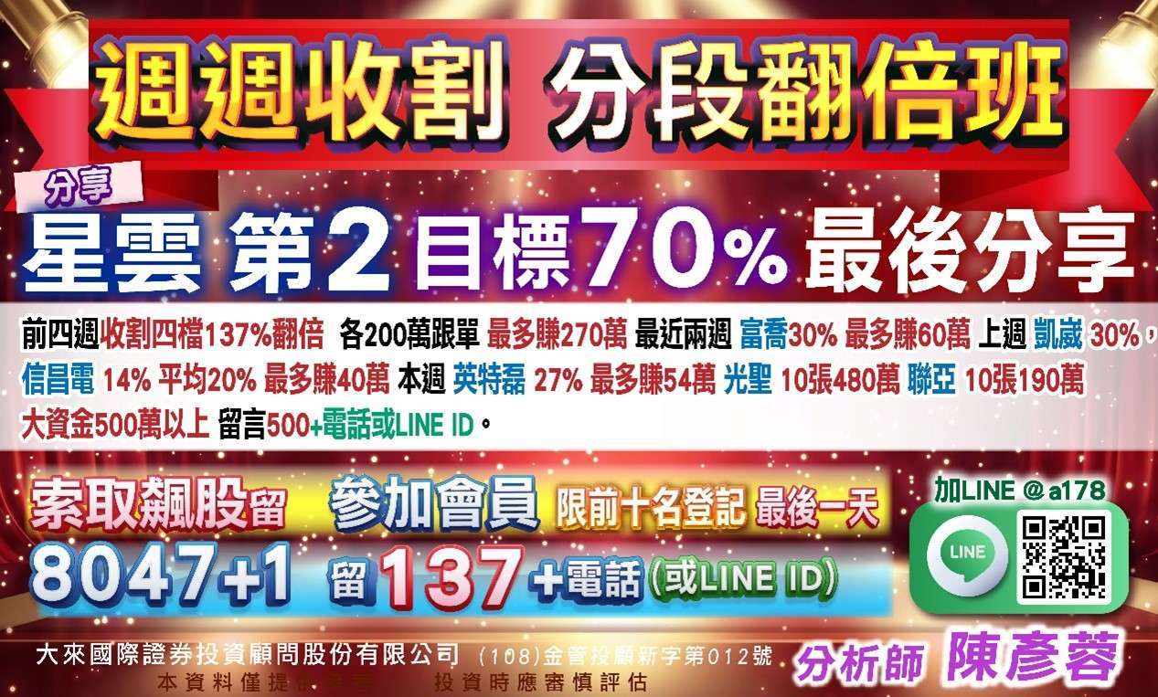 預告 星雲 (8047-TW),1 個月翻倍 140%。【星雲 第 2】,即將發動目標翻倍,加 line 留言【777+2】索取。