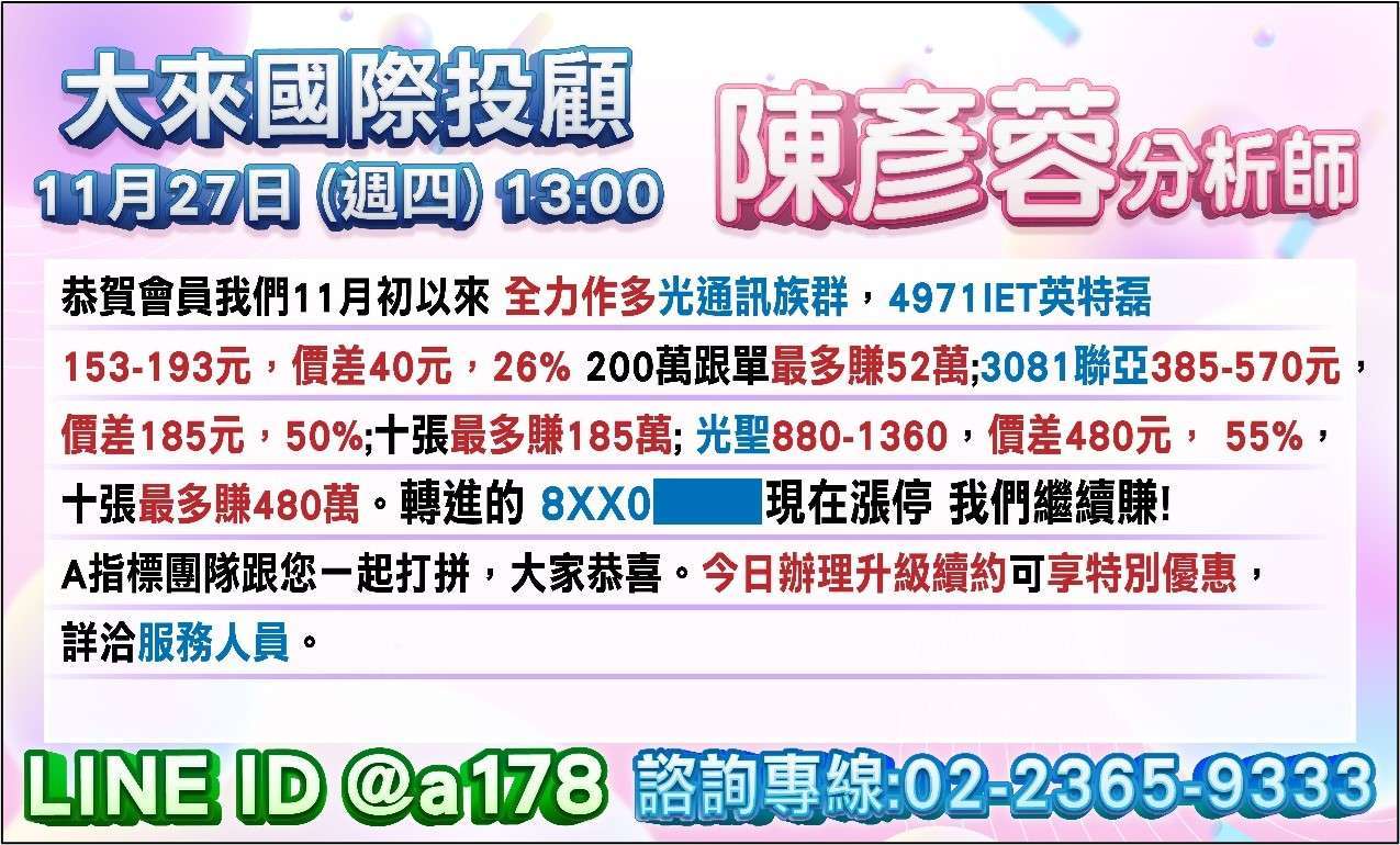 大來投顧陳彥蓉指出,美股受聯準會 12 月降息升溫,4 大指數同步收紅,資金行情持續有再新高機會;台股受谷歌新 AI 模型帶動台廠供應,回測整理後有再創新高機會。盤勢回測後第一隻腳反彈,搶對族群同樣大賺!光通訊收割,將重新轉進整理後族群,即將再次起漲,週週收割分段翻倍,專案最後一天現在登記。