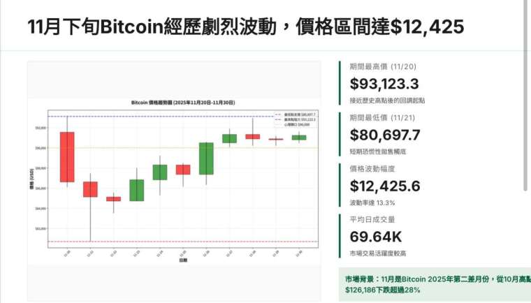 比特幣在 11 月遭遇明顯修正,從高位的 110000 美元急挫至 80,600 美元,創下自 2018 年以來最差的單月走勢。多頭已接受本月收跌的現實,但過去 7 天走勢顯示市場開始企穩,比特幣重新站上 90000 美元,七日漲幅達到 10.6%。雖然距離突破 100,000 美元仍有距離,這波反彈讓投資者再次關注 12 月是否會迎來年度最後一段升勢。
