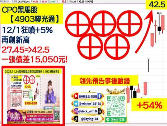 光通訊族群表現火熱,(4903-TW) 聯光通,亮燈漲停,27.45 =>42.5 領先預告後大漲 +54%,第 3 季獲利創歷史新高,毛利率攀升至 19.35%,每股純益 0.82 元,由虧轉盈,加上 10 月營收年增超過 5 倍,工程合約認列效益逐步顯現,買盤強力湧入
