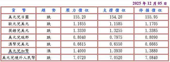美國民間就業數據不佳,加劇經濟低迷憂慮,鞏固美國聯邦準備理事會 (FED) 下周降息的理據,而且路透調查多數匯率策略師基本仍堅持預期 2026 年美元將因降息押注走軟,週四令美元持續承壓;此外,日本內閣官房長官木原稔認為近期日圓快速和單向波動,將採取適當行動,並據日本央行 (BOJ) 總裁植田和男對國會表示難以估計日本中性利率,BOJ 能把利率提高到甚麼水平存著不確定,但三位了解相關討論的政府消息人士稱,BOJ 可能 12 月上調政策利率 25 個基點至 0.75%,且預計政府容忍此決定,其中一位消息人士更幾乎確定 BOJ 將在本月加息,引發指標十年期日本公債收益率觸及十八年高位,而且時事社報導,BOJ 正在執行中性利率水平評估,提供日圓支撐,美元兌日圓受限於 155.54 高點。