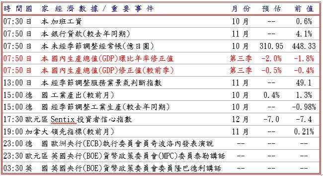 隨後數據顯示德國 10 月工業訂單較前月增 1.5% 超過預期,並據歐盟統計局公布歐元區第三季國內生產總值 (GDP) 分別較前季與去年同期成長 0.3% 及 1.4% 符合預估值,但德國經濟研究所 (IW) 預測,德國出口疲軟且全球貿易放緩,明年經濟復甦仍乏力,而且歐洲央行 (ECB) 管理委員會委員維勒魯瓦稱,通貨膨脹雙向風險均衡,需保持政策靈活,打壓歐元兌美元至 1.1627 低點。預估今日歐元兌美元阻力於 1.1650-70,支撐於 1.1560-80。