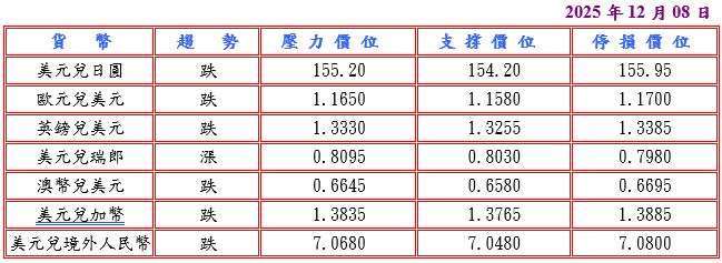 感恩節假期期間的調整難度,可能為美國上周初請失業金人數降至逾三年低點的原因,但市場普遍預計美國聯邦公開市場委員會 (FOMC) 在 12 月 9-10 日會議降息 25 個基點,焦點更在美國聯邦準備理事會 (FED) 主席鮑威爾釋出多少進一步寬鬆空間的信號,上週五令美元承壓;此外,日本政府數據顯示,10 月家庭支出意外較前月跌 3.5%,並較上年同期降 3.0%,為六個月來首次下降,降幅更為去年 1 月以來最大,但 11 月外匯儲備增至 13,594 億美元,並據日本財務大臣片山皋月稱與日本央行 (BOJ) 總裁植田和男溝通良好,而且前 BOJ 調查統計局局長龜田製作預計 BOJ 總裁植田和男可能指出中性利率在多大範圍內,但不會給出更明確消息,可是日本內閣官房長官木原稔表示政府對外匯市場快速及單邊波動感到擔憂,準備必要時採取適當措施,推動日圓上漲,美元兌日圓跌至 154.32 低點。