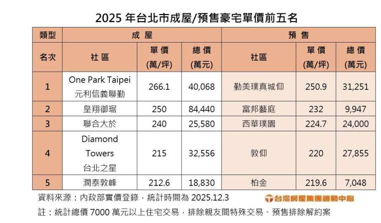 觀察今年截至目前為止,2025 年豪宅單價排行,「One Park Taipei 元利信義聯勤」每坪 266.1 萬元居冠;其次為「皇翔御琚」1-2 樓戶交易,總價約 8.4 億元,250 萬元為今年實價揭露的豪宅單價亞軍、總價冠軍;另外,「聯合大於」單價 240 萬位居第三,「Diamond Towers 台北之星」以 215 萬元位居第四,「潤泰敦峰」212.6 萬元名列第五。