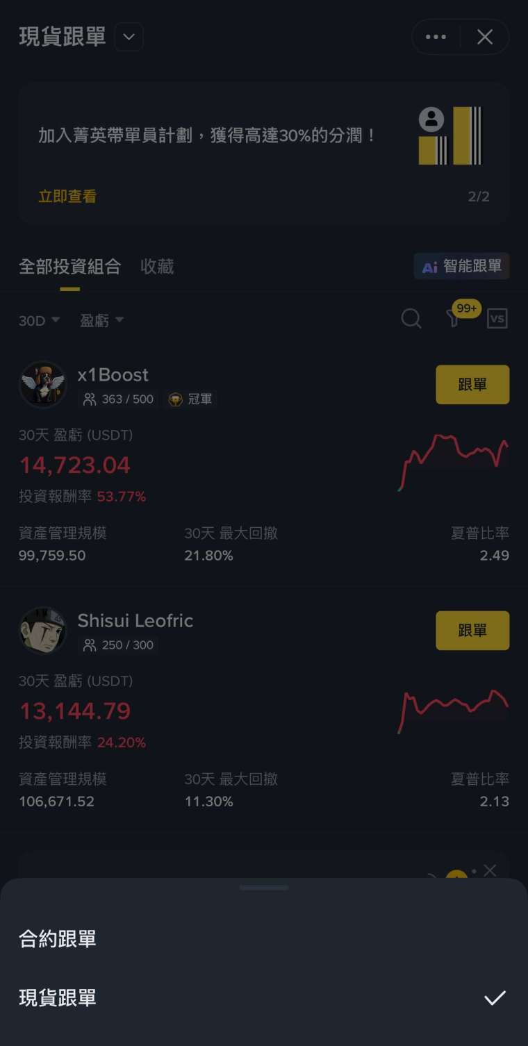 點進「跟單交易」,會看到:現貨跟單(偏長線)、合約跟單(短線、波段、槓桿)。