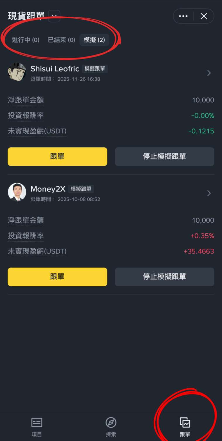 在跟單頁面點擊右下方「跟單」,就能查看自己目前所有跟單的情況,針對進行中的跟單、模擬跟單,點擊「停止跟單」,就能停止跟單了。