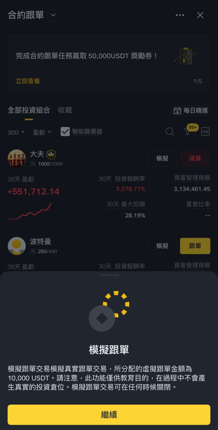 不過!如果你還沒準備好,想要先練習,幣安也提供「模擬跟單」,提供你一定的模擬金額去操作跟單,全程都是模擬用途不會產生任何真實費用。