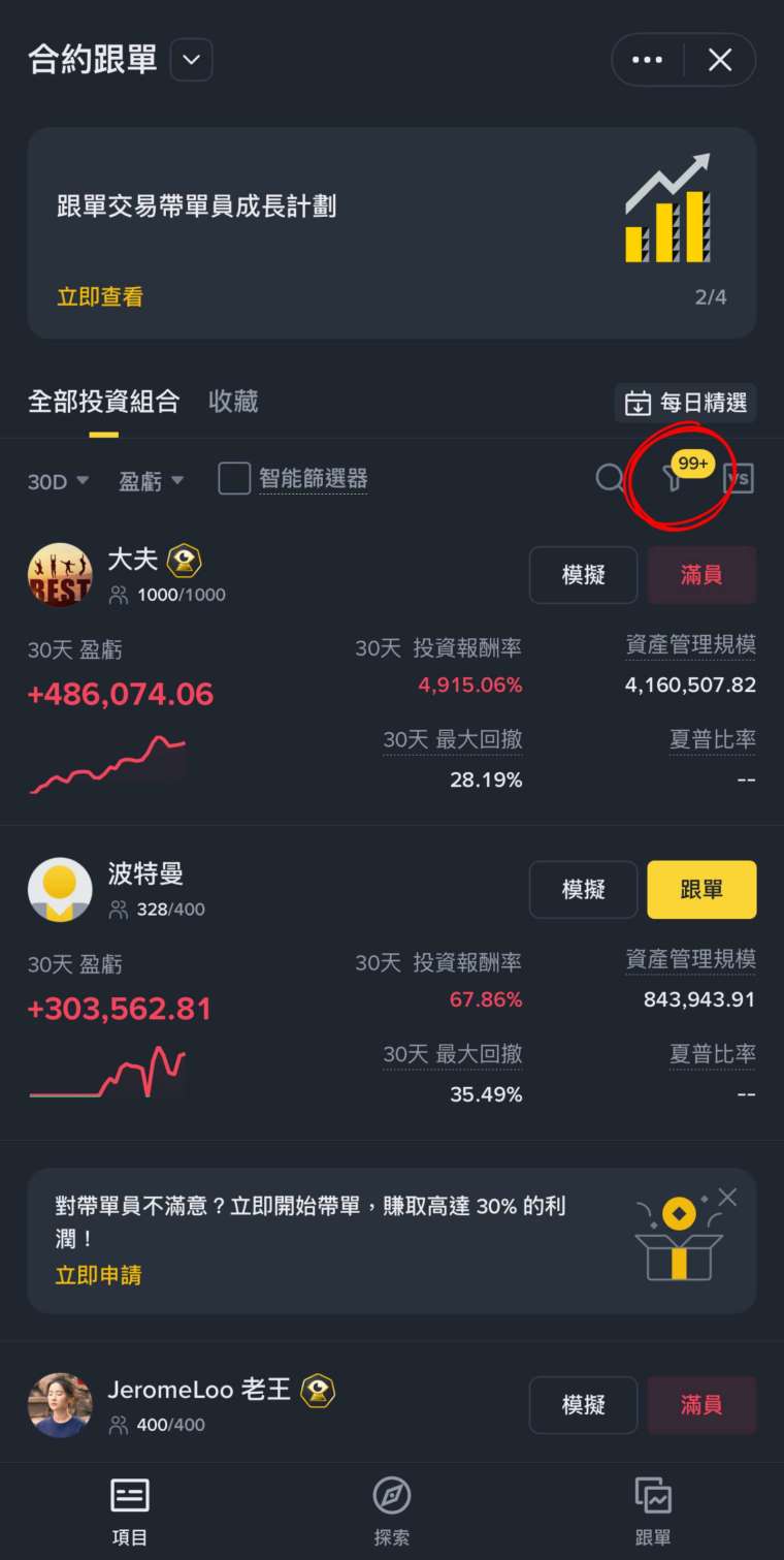 可以點擊下方圖示圈起來的「進階篩選」,依照自己在意的項目來篩選跟單員喔。不用自己選方向,選人比選幣更重要!