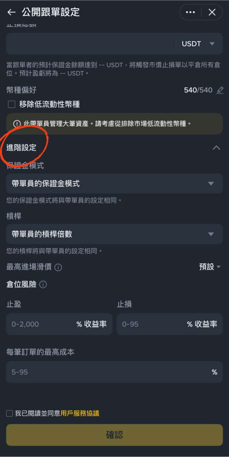 確定跟單員,點擊「跟單」之後,在「進階設定」下方,可以設定其他參數,如保證金模式、槓桿和倉位風險等。