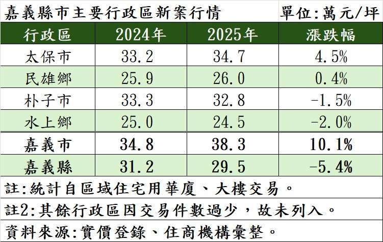 另在嘉義縣市方面,觀察數據,嘉義縣今年新案平均成交行情來到 29.5 萬元,相較去年修正 5.4%;不過,其中仍有太保市房市表現較佳,今年嘉義市新案成交行情達 34.7 萬元,年漲幅約 4.5%;另外,嘉義市新案行情則來到 38.3 萬元,為大嘉義地區房價領頭羊,且較去年仍維持成長 10.1%。住商不動產嘉南區協理陳佩吟補充,太保市近期受惠於嘉科議題,加諸有嘉義高鐵特區廣大開發用地,吸引不少品牌建商進駐,進而推升行情逐漸起漲;至於嘉義市,近期市中心啟動指標都更案,帶動新案行情上揚,亦吸引部分北部建商進駐垂楊路、文化夜市一帶,令市區整體房價具支撐力道。