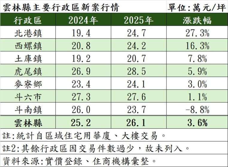 依實價登錄資料,雲林縣今年新案平均行情約每坪 26.1 萬元,其中不少行政區皆呈現大幅起漲,如北港鎮今年新案平均成交單價來到 24.7 萬元,相較去年飆漲 27.3%。大家房屋北港財神加盟店店東蘇聖賓分析,北港鎮屬於雲林海線的商業、文化以及生活中心,整個生活圈人口預估有近 14 萬人以上,加上近期北港糖廠周邊土地逐漸活化,吸引商場、連鎖品牌進駐,商圈機能成熟,但北港鎮蛋黃區土地稀缺,新案供給跟不上需求,預售價格有起漲空間。