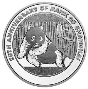 31.104克(1盎司)圓形銀質紀念幣背面圖案為熊貓食竹圖,並刊“上海銀行成立20周年紀念”英文字樣及面額。