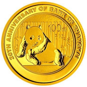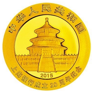 7.776克(1/4盎司)圓形金質紀念幣背面圖案為熊貓食竹圖,並刊“上海銀行成立20周年紀念”英文字樣及面額。