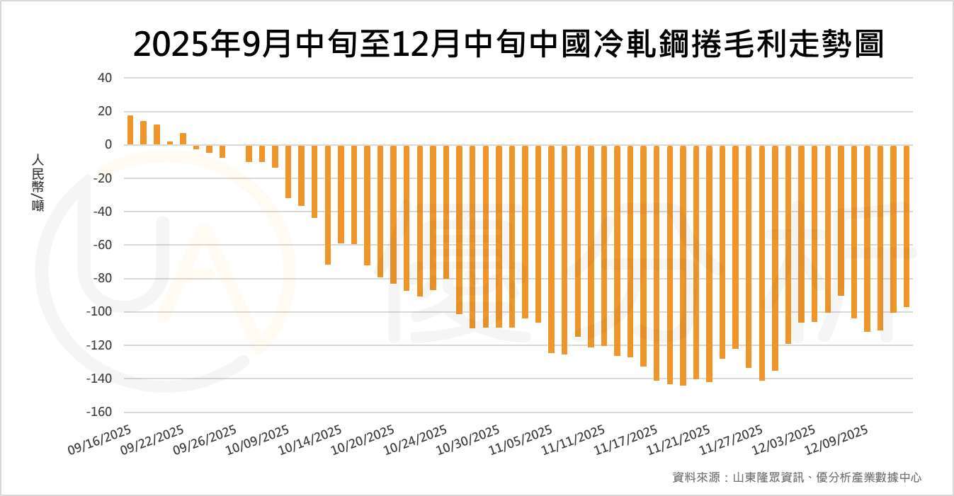 根據山東隆眾的數據顯示,自2025年9月中旬以來,中國冷軋鋼捲的毛利(Gross Profit)出現持續惡化的趨勢,自9月23日起轉為負值後一路下探,最深虧損出現在11月19日,每噸虧損達RMB 144元,顯示鋼鐵行業利潤壓力日益嚴峻。