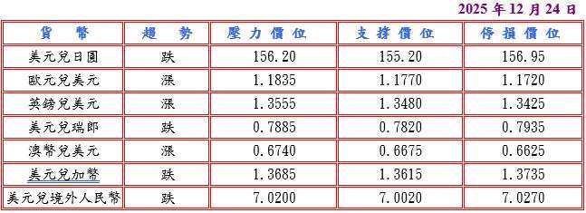 隨後美國第三季初值數據顯示,受強勁消費支出推動,國內生產總值 (GDP) 環比增長年率遠高於預期達 4.3%,個人消費支出 (PCE) 物價指數與核心 PCE 物價指數則分別漲 2.8% 及 2.9% 符合預期,而且美國 11 月工業生產較前月成長 0.2% 及產能利用率為 76.0% 優於預估值,但 11 月製造業產出較前月持平不及預期及 10 月耐久財訂單較前月降 2.2% 超過預估值,而且世界大型企業研究會公布美國 12 月消費者信心指惡化至 89.1,打擊美元兌日圓至 155.63 低點,可是白宮經濟顧問哈西特稱,經濟數據顯示美國經濟增長強於預期,是總統川普的貿易政策和對人工智能 (AI) 投資結果,預示未來就業增長速度將更快,限制美元下跌。今日部分市場聖誕假期休市,預估美元兌日圓阻力於 156.20-40,支撐於 155.00-20。
