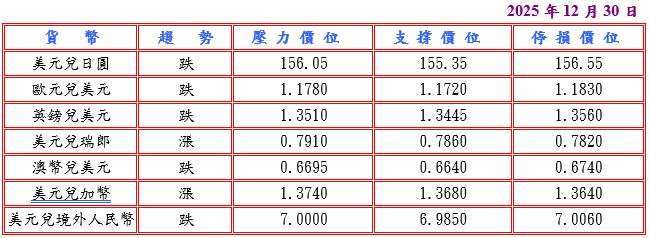 隨後全美不動產協會 (NAR) 數據顯示,住房可負擔性改善吸引買家,11 月成屋待完成銷售較前月增長 3.3% 高於預期,並較上年同期成長 2.6%,創 2023 年 2 月以來最高水平,而且受助於美國總統川普總統的減稅政策、關稅不確定性下降、人工智能 (AI) 熱潮持續及 FED 年末一系列降息帶來的提振,預料 2026 年美國經濟有望走強,但亞洲劍拔弩張的緊張情緒仍繼續,包括中國解放軍組織大規模圍繞臺灣進行軍事演習及北韓可能在元旦前後進行更多遠程導彈發射試驗,地緣政治緊張氣氛增添日圓的避險買盤,而且投資人密切關注美國聯邦公開市場委員會 (FOMC) 週二公布 12 月會議紀錄,以尋找決策者如何在通貨膨脹風險和勞動力市場疲軟之間取得平衡的線索,推低美元兌日圓匯價至 155.91 低點。預估今日美元兌日圓阻力於 156.05-25,支撐於 155.15-35。