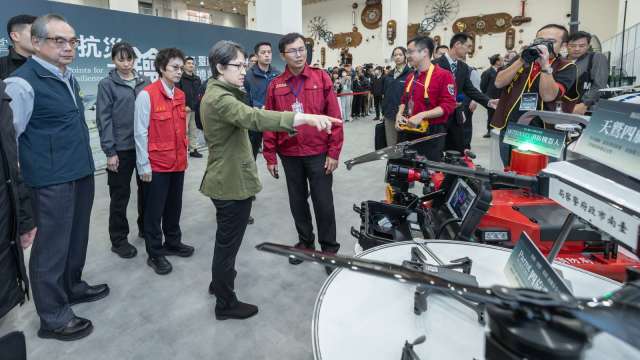 蕭美琴提到,現場展示許多新興科技,像是物流型及防災型無人機,包括面臨通訊中斷、偏鄉投藥、病媒蚊消毒、物資支援等問題時,均可運用無人機大幅提高救災工作效率,也可協助災後加速評估災損狀況,從以往需要勘查一周時間縮短到 2 個小時,未來她更期待民間創新,能夠提出更多救災解決方案。