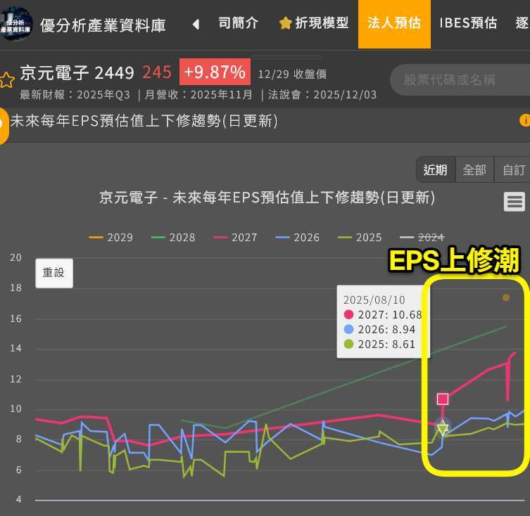 根據【優分析產業資料庫】的法人預估值上下修記錄,京元電EPS從8月10號開始出現明顯大幅度上修。