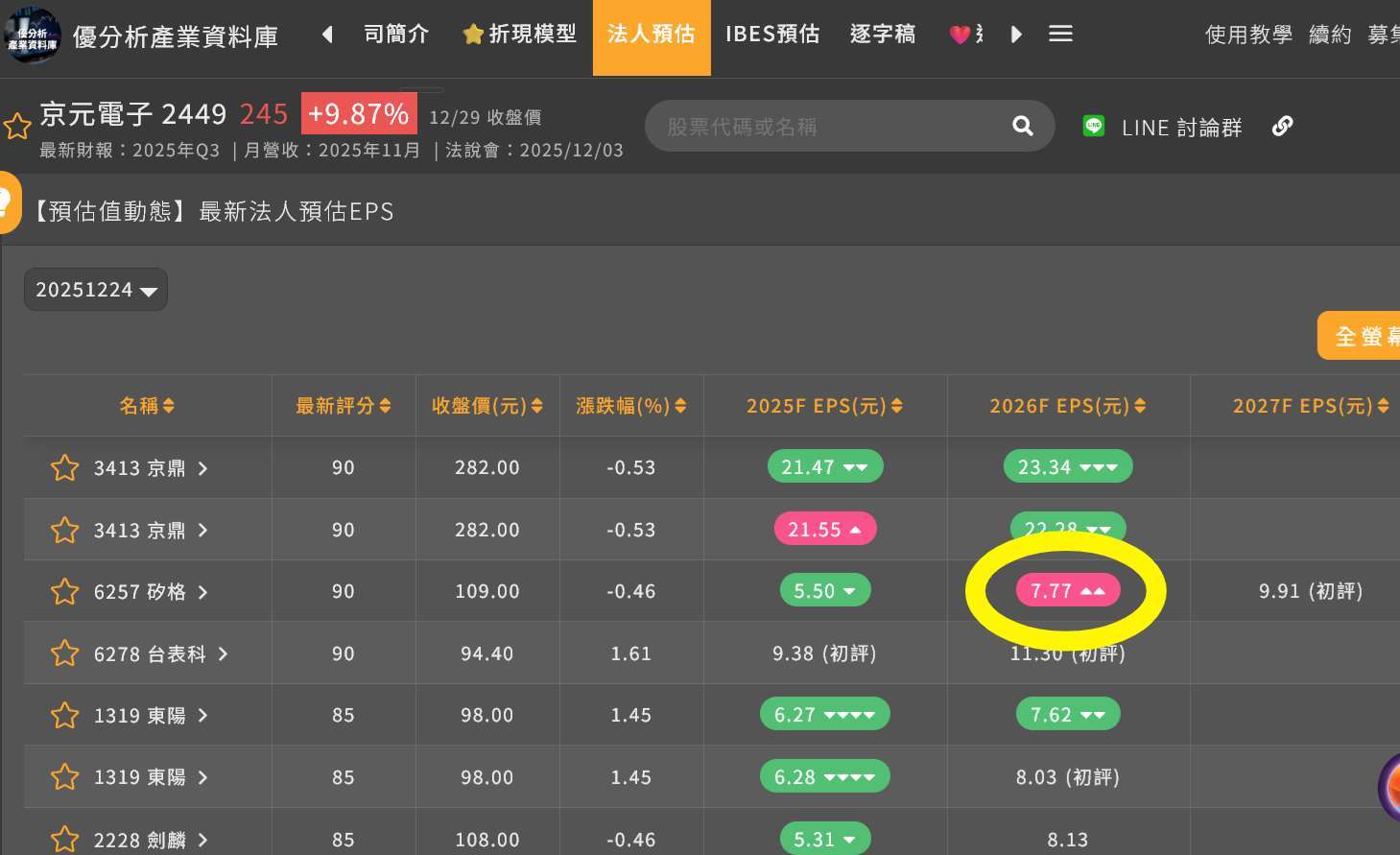 優分析產業資料庫有一個非常恐怖的選股功能,他可以告訴你每天被法人上下修EPS的公司有哪些。透過這個功能,我們可以在第一時間找到哪些公司的『故事』已經出現變化,即時發現可能的機會。