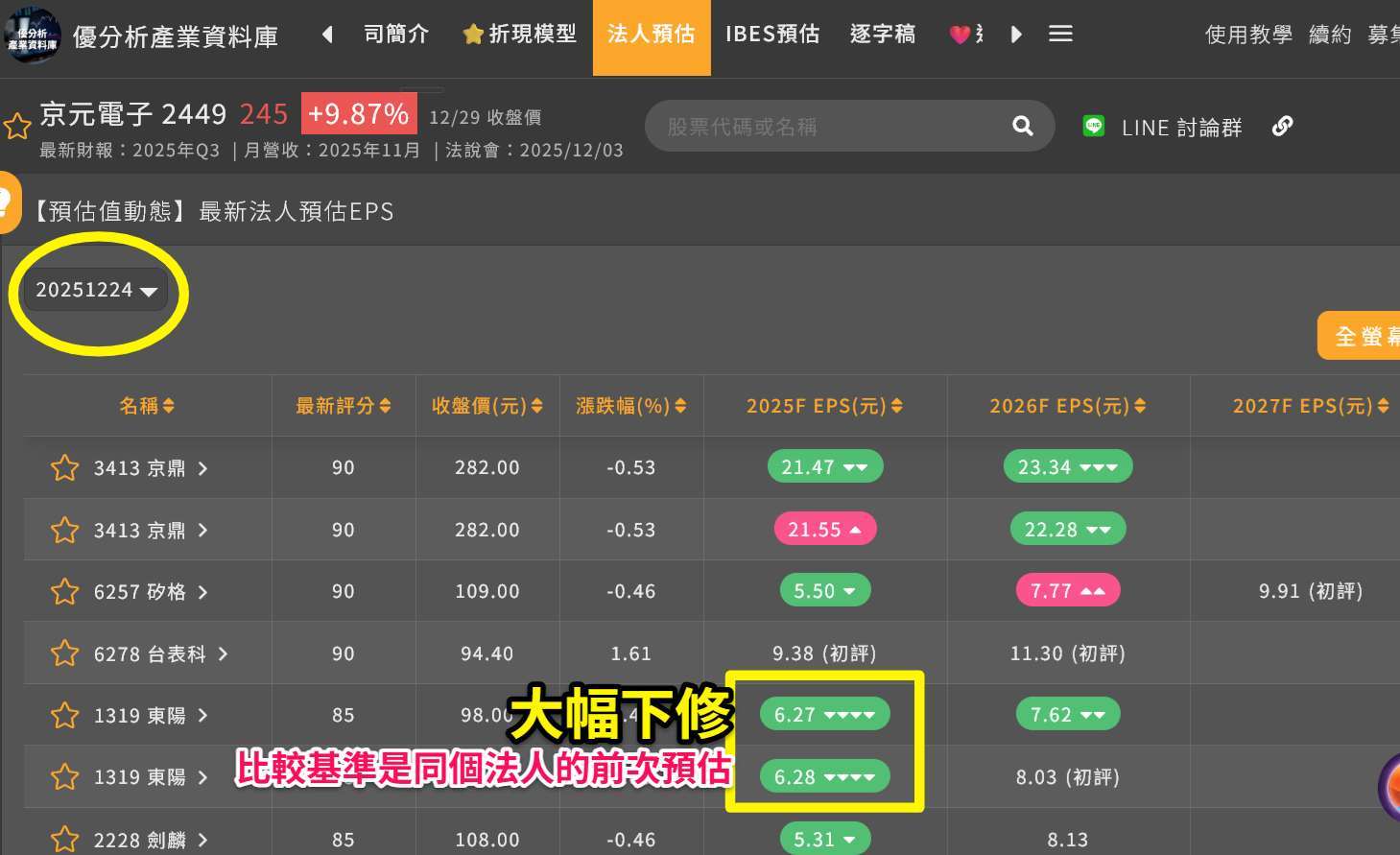 在左上角選擇日期,就可以看到當天被上下修的清單,紅色箭頭代表上修,綠色箭頭代表下修,箭頭數量越多修正的幅度越大,像東陽2025年的EPS有4個綠箭頭,代表被該名法人超大幅下修。
