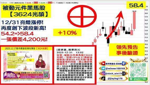 (3624-TW) 光頡,54.2 => 58.4 領先預告後大漲 +10%,於法說會指出,受惠產品結構升級與需求回溫,2026 年整體營收有機會突破 30 億元,公司預期自明年第一季起,薄膜電感價格將調漲約 10% 至 40%,反映供需結構轉變及成本、報價同步調整,需求面方面,光頡長期布局車用市場,近期取得車載大單,並成功通過美系 CSP 的 AI 伺服器認證,相關應用單位用量為一般伺服器的一至二倍,成為營運成長關鍵,供給端則因中國晶片電阻廠陸續減產,供給趨於收斂,有助價格回穩,法人關注毛利表現,光頡表示大股東風華高科已對部分被動元件啟動漲價,後續產能與價格動向,將持續影響市場供需格局。