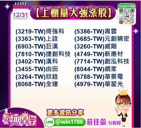 展望後市,聯準會公布 12 月政策會議紀錄,顯示官員對降息時點與後續政策路徑出現明顯分歧,市場解讀偏向保守,交易員預期 2026 年 1 月按兵不動機率約 84%,3 月是否轉向仍呈五五波,國際方面,傳出輝達評估以最高約 30 億美元收購以色列 AI 新創 AI21 Labs,凸顯 AI 版圖加速整併,台股後市觀察,AI 算力結構正快速重組,焦點不再侷限於傳統 GPU,研調機構預估,2026 年全球 AI 伺服器出貨量上看 250 萬台,自研 ASIC、TPU 比重提升,帶動新一波 AI 基建投資,製程方面,台積電 2 奈米已如期量產,後續 N2P 與 A16 製程將鎖定 AI 與 HPC 需求,技術面來看,加權指數高檔震盪但守穩短期均線,OTC 續強,資金輪動至中小型題材股,盤面聚焦記憶體、先進封裝與光通訊族群,整體而言,台股在 2025 年最後一個交易日展現出「萬馬奔騰」的氣勢,在基本面與題材支撐下,台股高檔盤堅,操作宜分批布局 AI 與業績題材股,目前應聚焦「位階低、展望佳」的標的,矽光子、記憶體及 PCB 等族群在利潤回升的背景下,具備元月行情續攻的潛力,建議投資人盤中可逢低擇優布局,隨著投信與集團作帳進入最後衝刺,2026 年初的「作夢行情」已在今日的創新高中悄然啟動。