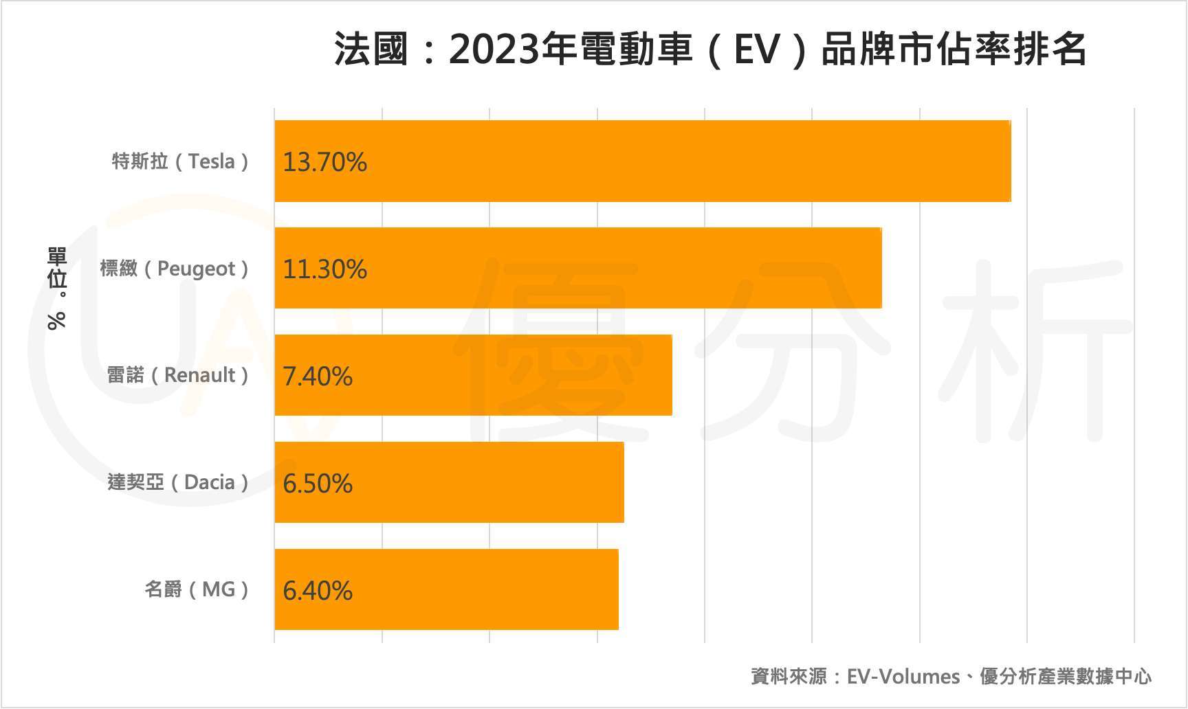 根據市調機構統計,特斯拉於2023年以13.7%市佔率位居法國電動車市場首位,但其領先幅度有限,顯示市場競爭高度激烈;同時,多個歐洲與非歐洲品牌市佔率接近,反映法國EV市場呈現多品牌分散格局。
