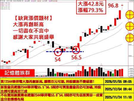 受惠 AI 浪潮需求帶動「記憶體」族群缺貨漲價題材效應持續發酵,因此,我們在 54 元及 56.5 元帶著家族成員全力鎖定的華邦電 (2344-TW),至今日大漲再創 96.8 元新高,單趟價差最高 + 42.8 元,價差獲利達 + 79.3%,10 張現賺 42.8 萬,100 張現賺 428 萬,恭喜大家!