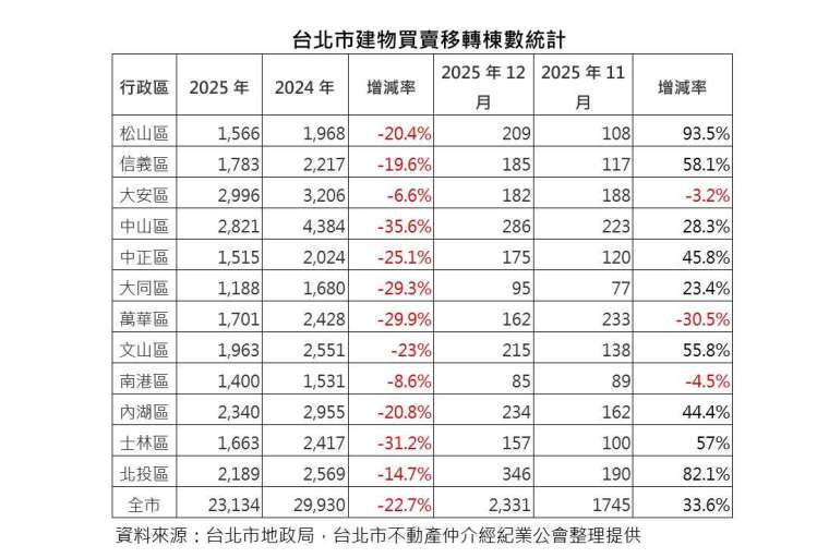 根據台北市地政局的統計,2025 年 12 月台北市建物買賣移轉棟數呈現小龍擺尾之勢,交易量達到 2331 棟,與 11 月份比較起來,大幅成長 33.6%,這是去年一整年當中少見的跳躍式增長。累計去年 1- 12 月,台北市全年的買賣移轉棟數為 2 萬 3134 棟,與 2024 年 2 萬 9930 棟比較,仍然出現 22.7% 的負成長,是 2016 年來近 9 年來最差的數字。