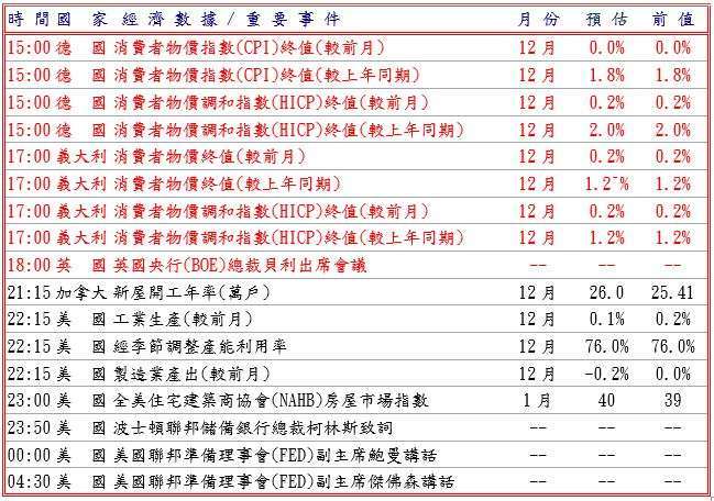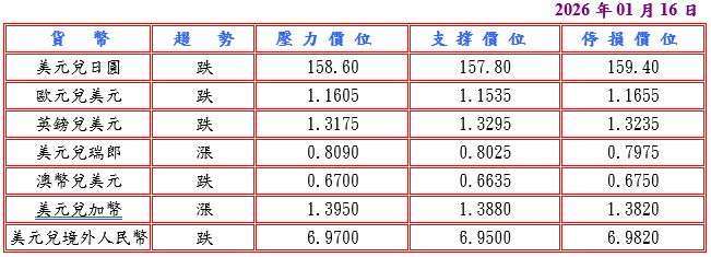 隨後德國聯邦統計局表示,經濟在去年第四季增長 0.2% 及全年成長 0.2% 符合預期,並據法國公布 12 月消費者物價調和指數 (HICP) 終值較上年同期漲 0.7% 與預估值相符,歐元區 11 月工業生產則較前月升 0.7% 高於預期上升 0.5%,但歐洲央行 (ECB) 管理委員會委員卡薩克斯稱,通貨膨脹和經濟增長面臨雙向風險,ECB 沒有自滿的餘地,而且面對美國總統川普奪取格陵蘭的野心,歐洲多國向格陵蘭派遣軍事人員,削弱風險偏好,打壓歐元兌美元至 1.1592 低點。預估今日歐元兌美元阻力於 1.1605-25,支撐於 1.1520-40。