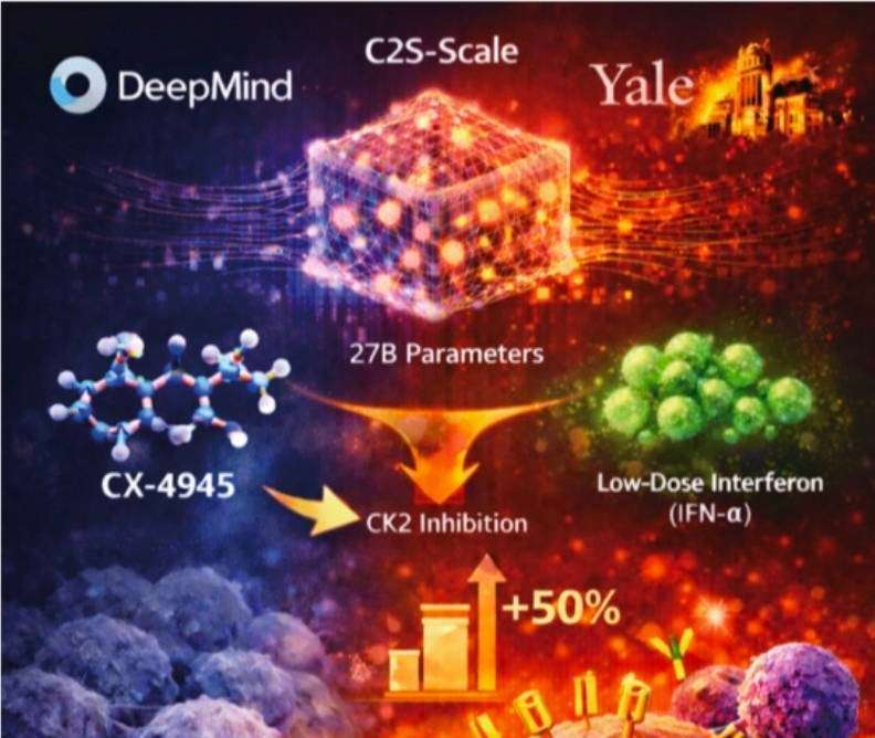 其中,CK2 是一個參與多種病態路徑的關鍵節點,牽涉腫瘤增生、轉移、DNA 修復與抗藥性。CX-4945 在全球同類中具稀缺性,並且已推進至臨床二期開發 階段。而讓 4945 近來能見度急速攀升的,還有一條跨界線索:AI 模型對藥物合併策略的指向。過去國際上不少業界都曾與「用超級電腦預測藥物」的新創合作,最後常卡在毒性、吸收、或無法進入臨床,但這次 Google DeepMind 的 Al 模型與耶魯大學臨床實驗指向的,是一個已有人體臨床安全性資料,且運用海量數據與不同方法演算都指向同一結論。