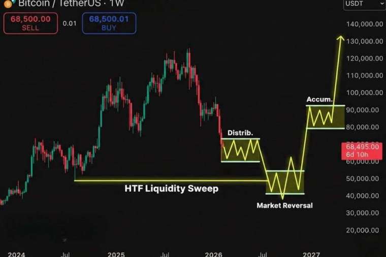 宏觀推演的特徵在於時間尺度較長,路徑也不會是直線拉升,更可能呈現 N 字型節奏,也就是突破後的回踩整固與再度推進交替出現。以週線邏輯估算,最終目標被放在 130000 至 140000 美元區間,時間跨度延伸到 2026 甚至 2027,指向的是長週期資金佈局,而非短線追逐。這類目標能否實現,取決於底部流動性獲取是否成立、再吸籌能否完成、以及突破後能否在回踩中維持結構完整。