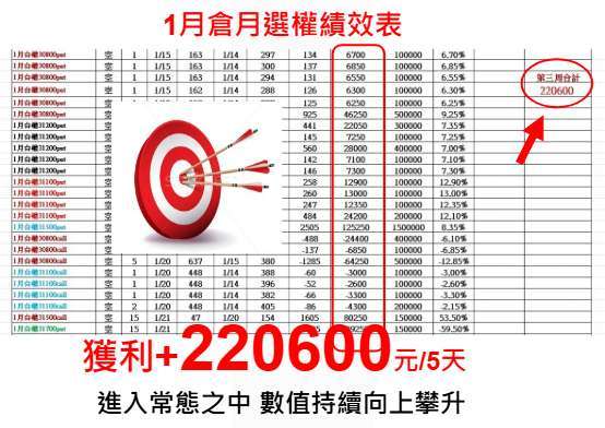 應用這套策略,我們上周進場的『一月台指選擇權』空單部位 (賣出 C/P) 於本周三全數回補出場,僅用五天時間獲利高達 + 220600 元。隨之進場,最新一組的下周三到期的『一月第四周台指選擇權』至今日,僅用二天時間目前已平加未平倉獲利已達 + 126000 元!績效見下圖!