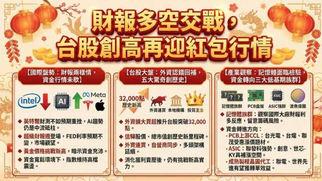 美股近期呈現明顯的「強弱分歧」。英特爾(Intel)因財測不如預期,股價單日重挫 17%,反映出傳統伺服器市場的競爭壓力;然而,市場傳出中國有望放行輝達(NVIDIA)H200 晶片銷售,激勵 AI 晶片族群普遍上漲,顯示 AI 趨勢仍是市場中流砥柱。 本週將迎來「超級財報週」,微軟、Meta、特斯拉、蘋果等重量級科技巨頭將陸續公布財報,加上週四(1/29)FED 利率會議預期將維持利率不變,市場觀望氣氛濃厚。值得留意的是,黃金價格持續挑戰歷史新高,這是一個重要的總經訊號,暗示市場資金水位依然充沛。在資金寬鬆的環境下,股市難有大幅走空的理由,預期指數將維持高檔震盪,透過類股輪動來消化財報變數。