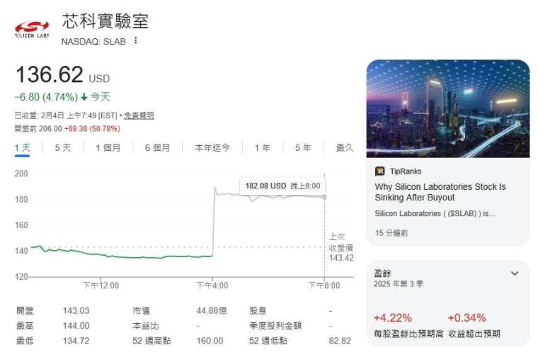 依照交易條件,德州儀器將以每股 231 美元現金收購 Silicon Laboratories 普通股,較消息曝光前的收盤價溢價約 69%。消息公布後,Silicon Laboratories(SLAB-US) 盤前股價上漲逾 50%,隨後暫停交易;德州儀器股價則下跌約 3.4%。