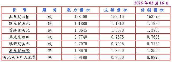 美國 1 月就業增長加速及失業率下降,但數據修正顯示去年勞動力市場幾乎停滯,初請失業金人數降幅則低於預期,同時 1 月成屋銷售降幅創近四年最大,而且美國聯邦準備理事會 (FED) 理事米蘭稱,FED 當前貨幣政策立場威脅經濟增成,再闡述進一步降息的理由,上週五令美元遲滯,並據日本首相高市早苗經濟顧問本田悅朗表示,政府未必挑選再通貨膨脹派人士填補日本央行 (BOJ) 審議委員空缺,而且 BOJ 審議委員田村直樹認為通貨膨脹變得內生且具黏性,主要驅動因素從原材料價格高企轉向反映就業市場趨緊的勞動力成本上升,日本今年春季前後實現 2% 通貨膨脹目標的可能性很大,暗示今年春季可能加息,但據路透調查,汽油成本下降及食品價格漲幅減緩,預計日本 1 月核心消費者物價指數 (CPI) 較去年同期連續第二個月放緩至 2.0%,令日圓承壓,推動美元兌日圓回升至 153.66 高點。