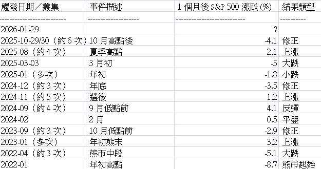 歷史數據顯示,興登堡凶兆出現在過去數十年來每一次重大的股市頂部,包括 1987 年崩盤、2008 年金融危機以及 2020 年的疫情崩盤。根據統計,在該指標觸發後的 1 個月內,標普 500 指數平均會出現 2.03% 的跌幅。